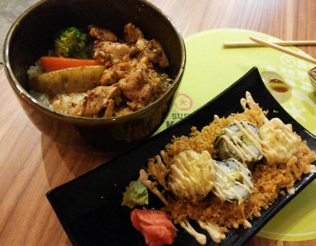 Tsunami Don dan Rosco menjadi pilihan utama. Disajikan hangat. Rice Bowlnya menebarkan aroma daging yang gurih semerbak. Penampilannya juga cantik menggiurkan. Sushi Rosco (Rp 50.000) ukuran kecil yang berisi empat buah sushi.