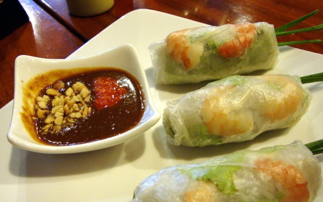 Sebagai pembanding yang setara, kami memesan Goi Cuon Tom Ga (Rp 36.000) di MonViet yang terdiri dari tiga buah lumpia berukuran sedang. Beberapa helai kucai diselipkan di salah satu ujung masing-masing lumpia. Bumbu kacangnya diberi cacahan kacang tanah dan sedikit sambal ulek.