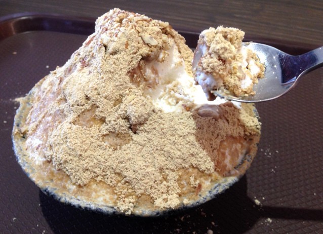 Es serut Korea atau bing su sedang populer. Di gerai ini ada beragam bing su dengan aneka topping. Seperti es serut bertabur injeolmi dengan bubuk kacang kedelai. Dinikmati bersama roti panggang legit berisi lumatan ubi. Yummy!
