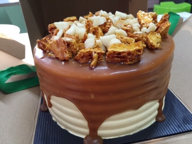 Cake ini datang dengan kemasan cantik dan rapi. Karton tebal berwarna putih dengan pita berwarna hijau tua. Ketika dibuka, tampilan cake seperti pada gambar di website. Berlapisan krim putih dengan lelelan salted caramel dan bongkahan honey comb di atasnya.