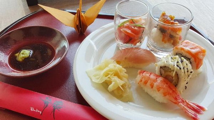 Di balik lemari kaca ada sashimi berupa irisan fillet maguro, tuna, dan salmon. Pilihan sushinya juga beragam. Nyaris bikin bingung. Ada nigiri sushi seperti tamago, tuna, udang, dan salmon. Juga temaki sushi seperti california roll, kapa maki, tuna maki unagi roll, ebi ten roll.