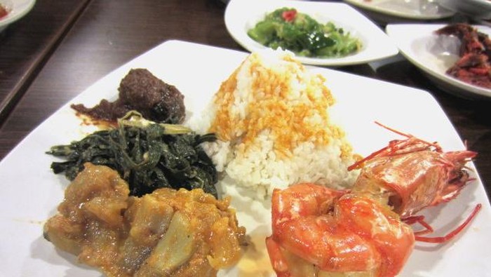 Wah, kamipun jadi bingung memilih. Kami mencicip rendang (Rp 21.000), ayam gulai (Rp 20.500), kikil (Rp 21.500), udang goreng (Rp 80.000), perkedel jagung (Rp 12.500), sayur singkong (Rp 13.500), dan sambal ijo (Rp 9.000). Semua menu kami ambil dan racik sendiri dengan nasi putih hangat yang sudah tersaji.