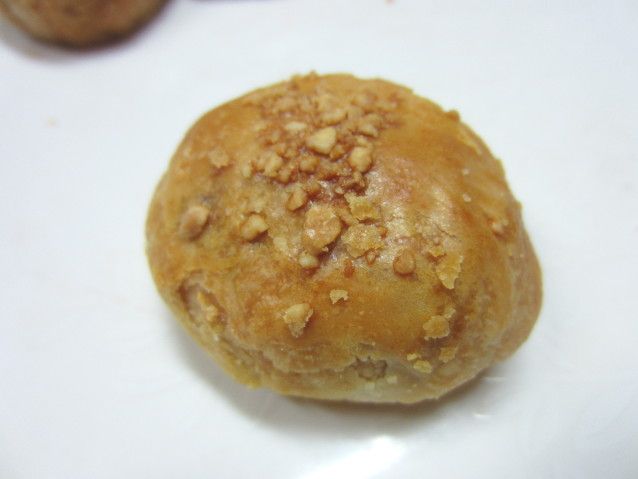 Pia cokelat ditandai dengan taburan wijen hitam di permukaannya. Cokelatnya berbentuk seperti pasta padat sehingga mengisi seluruh permukaan pia. Nyammm! Kami menyukai legit pekat cokelat dengan rasa manis pas alias tidak berlebihan.