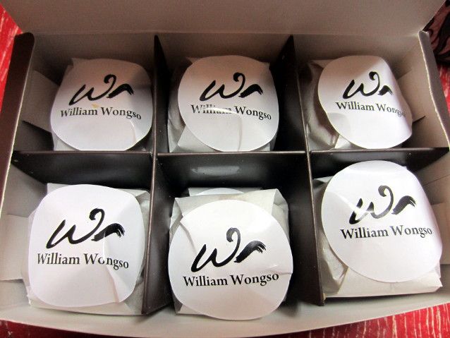 Tiap buah pia dalam kotak ternyata dibungkus kembali dengan kertas putih berstiker W yang melambangkan sang pembuat, William Wongso. Tampak permukaan bakpia berwarna kuning keemasan dengan taburan topping berbeda yang mencirikan isiannya.