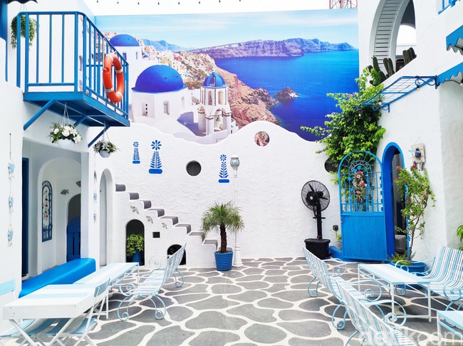 Bangunan yang didominasi warna biru dan putih ini sengaja dibangun dengan konsep ala Santorini di Yunani. Pengunjung bisa memanjakan mata sekaligus berpose instagenik sambil makan makanan enak.