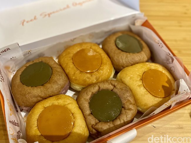 Bukan donat dengan aneka topping, gerai ini menawarkan donat dengan isian flan dari krim susu homemade. Teksturnya empuk dan lembut dalam satu gigitan.