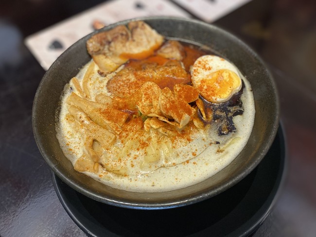 Ramen Beauty & Beast ini juga disajikan dengan topping ayam panggang, rebung, ajitsuke tamago, dan bawang putih goreng. Sensasi pedasnya ini berasal dari bubuk cabe yang disajikan sebagai topping.