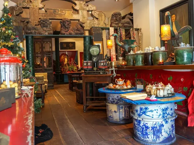 Interior klasik dengan sentuhan kayu dan ornamen vintage membuat pengunjung merasa seperti kembali ke masa kolonial.