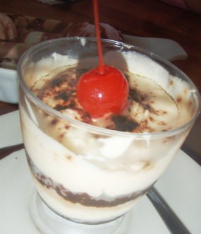 Namun sayang, untuk tiramisu meski tampil cantik namun rasanya tak begitu istimewa. Tiramisu tampil dalam wadah gelas dan selingan cream dan cake serta buah ceri diatasnya. Saat suapan pertama dessert khas Italia ini menyentuh lidah, hmm... terasa krim kocok yang jadi campuran olesan basah dan lembek. Sedangkan cokelat powdernya hanya ditaburkan asal saja sehingga tidak menutupi seluruh permukaan cake. Meskipun menurut saya rasa manisnya pas, jejak essens kopi yang khas masih dapat saya rasakan di lidah.