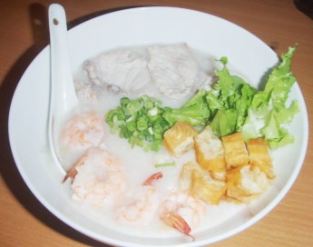 Bubur 3 Rasa pesanan saya tampil dalam mangkok putih berukuran cukup besar. Bubur putih yang mengepul panas ini diberi topping irisan ikan kakap, 4 buah udang, irisan cakwe, daun bawang, dan daun selada. Bubur tio chiu selain butiran nasinya masih terlihat, daun selada yang ditimbun bubur menjadi ciri yang unik. Hmm... semuanya tampak lezat di mata saya!
