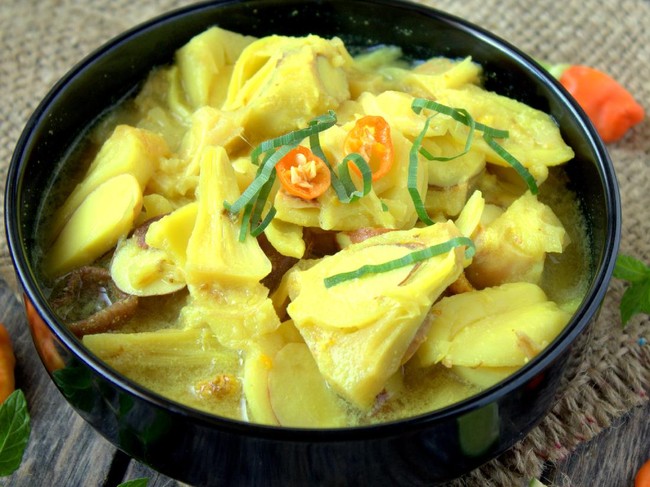 Olahan nangka muda ini bisa jadi pilihan lauk enak. Nangka muda yang empuk dimasak dengan bumbu kuning dan santan. Makin meresap makin sedap rasanya.