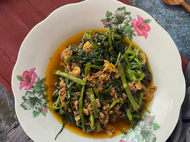 Gurih renyah tumis kangkung ini semakin sedap dengan bumbu terasi dan ikan asin. |
