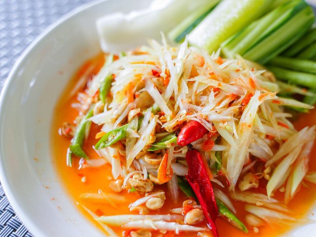 Selain seafood, Thailand tersohor dengan aneka buah dan sayuran segar. Salah satunya diolah jadi salad. Buah mangga Thailand yang renyah sedikit asam dan manis cocok diracik jadi salad dengan bumbu cabe.