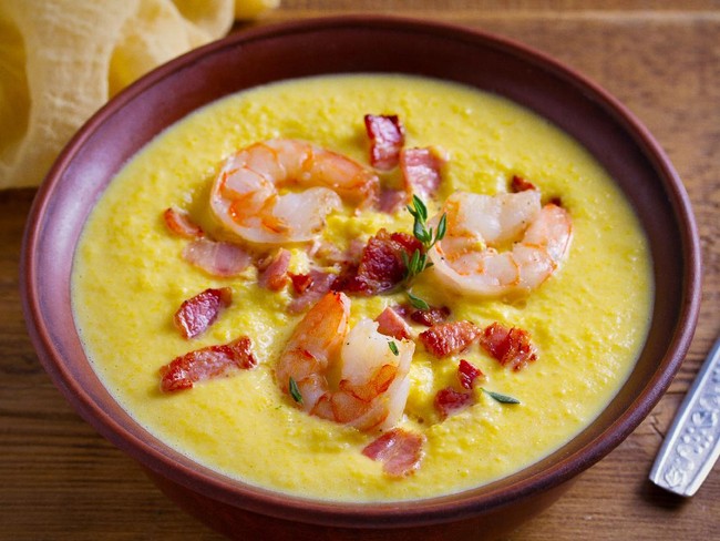 - Blender sebagian dengan kaldu udang hingga halus. Sisihkan sebagian biji jagung utuh.