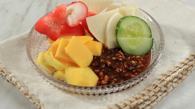 Rujak buah banyak disukai oleh ibu-ibu. Biasanya dijadikan camilan siang hari karena rasanya menyegarkan. Nikmati kreasi rujak buah ini dengan sambal lotis.