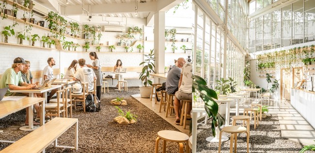 Pengunjung dapat menikmati indahnya interior modern yang disempurnakan oleh tanaman di sekitar, memberi sentuhan instagrammable cafe in Canggu yang begitu unik. Lokasi cerah karena banyaknya jendela di sekeliling menciptakan kesan outdoor yang unik pula.