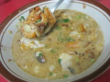 Tak heran jika warna kuah berubah menjadi sedikit cokelat. Taburan bawang goreng dan juga daun bawang yang telah diiris halus menambah harum aromanya. Saat kuahnya di hirup, hmm.. rasanya gurih harum aroma daging yang kuat. Rasa gurih sedikit pedas dari bumbu kacang nya juga membuat sensasi rasa yang cukup unik.