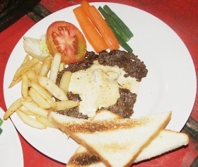 Jakarta - Beef Steak? Wouw.... sangat menggiurkan! Apalagi jika disantap hangat mengepul dari hot plate lengkap dengan setup sayuran dan French fries. Dagingnya empuk, berselimut bumbu, sausnya sangat gurih mengelus lidah. Dinikmati di sela-sela terpaan udara sejuk angin malam plus gemerlap indah bintang di langit, hmm...!Jumat malam kami sengaja melepas penat dengan berkeliling daerah Kelapa Gading. Apalagi kalau bukan untuk memanjakan lidah. Meskipun perut sudah dijejali pisang kremes khas Pontianak, jeruk, jambu dan sate tulang tapi rasanya belum juga kenyang. Sambil menyusuri Boulevard Kelapa Gading, kami tiba-tiba tertarik dengan deretan tenda di halaman Wisma Gading Permai alias WGP. Hm...ada bubur, bakso, roti bakar, seafood, nasi uduk, nasi liwet.... Membaca nama-nama makanan yang tertera di spanduk di luar pagar kami sudah tergoda. Akhirnya kami memutuskan masuk ke halaman WGP dan mulai mencari sasaran.Setelah mondar-mandir membanding-bandingkan, pilihan pun jatuh ke beef steak. Warung tenda berwarna merah bertulisan Rosewood Cafe: Steaks, Ribs, Soup, and Salad merupakan satu-satunya warung tenda yang menjual steak. Diterangi lampu pijar kemerahan, beberapa meja sudah dipenuhi pengunjung. Nama 'Rosewood' mengingatkan kami pada sebuah resto fine dining di Rosemont, Illinois, Amerika yang tersohor dengan USDA Prime Steak nya. Ternyata, dari daftar menu yang tertera di tenda plastik dan di daftar menu, variasi sajian steaknya sangat beragam dan menarik, tak seperti warung tenda umumnya. Tak jauh-jauh beda juga dengan yang di Amerika meskipun beda kelas.Menunya mulai dari sup, salad, pasta hingga beragam steak. Variasi steaknya meliputi beef, sirloin, ribs, lamb, chicken sampai fish. Khusus untuk sirloin Rosewood juga menyediakan sirloin impor USA. Untuk beef steak ada pilihan Empire, Rococo, Queen Anne, Mexican yang sangat memikat. Sementara untuk chicken steak ada Georgian, Cordon Bleu, Margaritha, dan Fish of Milan untuk pilihan fish steak. Minuman yang ditawarkan pun bermacam-macam, mulai dari teh tawar sampai Shirley Temple ada di sini. Pilihan kamipun akhirnya jatuh pada Mexican Beef Steak (yang paling disukai pengunjung), Chicken Cordon Bleu (yang sangat klasik), dan Sirloin BBQ sauce, dan Potato skin. Tanpa bertanya tentang kematangan daging (seperti lazimnya resto steak), pelayanpun sudah dapat memastikan kami memesan 'well done'. Sementara menunggu pesanan, tiupan sejuk angin malam menebarkan aroma harum mentega leleh dan gurih daging yang dipanggang di atas bara api. Sajian pertama, Sirloin Steak BBQ sauce disajikan di atas hot plate dengan kentang goreng, jagung manis, dan irisan tomat. Meskipun well done lapisan lemak yang ada di sisi daging terasa cukup empuk. Siraman saus BBQ yang asam manis gurih menjadi paduan yang pas. Chicken Cordon Bleu di sini sangat unik keju yang biasanya ada di bagian tengah daging, kini diletakkan di bagian luar. Daging ayam yang biasanya disajikan utuh, digulung agak besar. Rasa renyah lapisan tepung, bersatu dengan lumeran keju cheddar dan gurih sedap aroma smoked beef. Kalau Sirloin Steak disajikan dalam potongan tebal, maka Beef Mexican Steak berupa irisan minute steak yang sangat kuat rasa ladanya dan disiram saus jamur. Saus jamurnya memakai irisan jamur champignon dengan rasa krim segar yang kuat sehingga rasa asam pedas daging menjadi sangat balance. Hmm... tak kalah lezat dengan steak buatan steak house. Apalagi disajikan lengkap dengan setup sayuran plus dua potong toast. Irisan skin potatoes panggang dengan taburan smoked beef yang dicincang halus menjadi penutup yang pas. Gurih, renyah dengan aroma asap yang sedap!Soal harga? Steak Rosewood tak bakal mengempeskan kantong karena harga per porsinya tak lebih dari Rp. 30.000,00. Untuk satu porsi Sirloin Steak di patok Rp 28.000,00. Rp 24.000,00 untuk Chicken Ccordon Bleu dan Mexican Beef Steak. Nah, kalau ingin bersantap asyik berdua di bawah taburan bintang, steak dan ribs lezat di kafe tenda ini bisa jadi pilihan.Rosewood CafeSteaks, Ribs, Soup, and SaladPelataran Parkir Wisma Gading PermaiBuka: 18.30 - 23.00